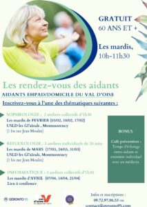 Elle collabore également avec différentes structures partenaires (Prif, Geronto 95, hôpital Simone Veil) qui mènent des actions pour les seniors ou leurs aidants : ateliers nutrition, sophrologie, informatique, groupes de parole…