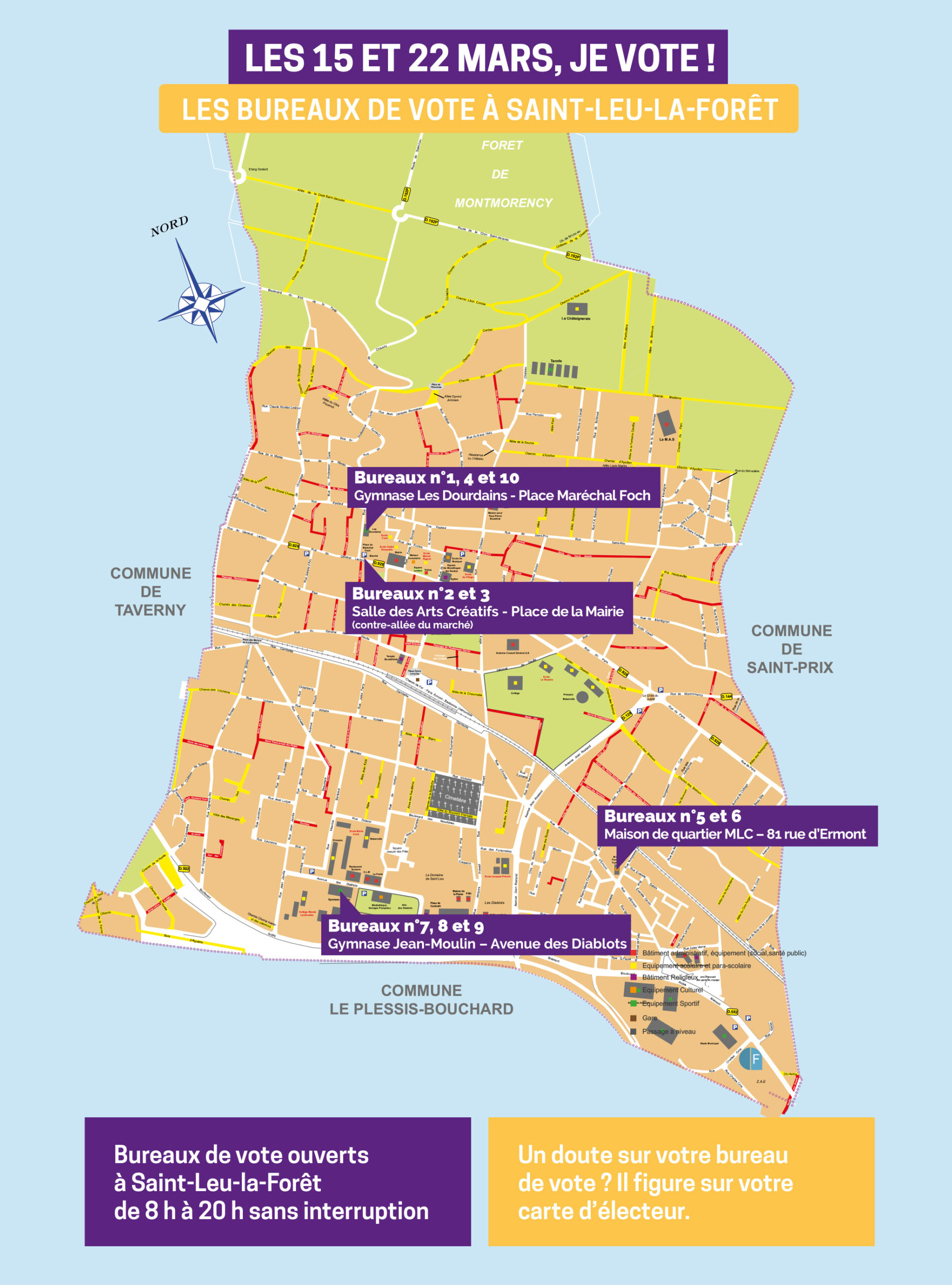 Chaque électeur a un bureau de vote attribué; celui-ci figure sur sa carte d’électeur. Il en existe 10 à Saint-Leu-la-Forêt.