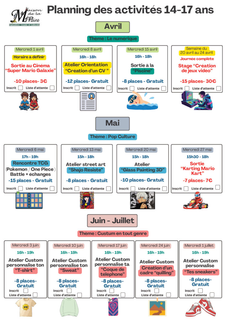La Maison de la Plaine dévoile sa nouvelle programmation d’activités pour les mois d’avril à début juillet. Que vos enfants/ados soient passionnés d’art, de jeux vidéo ou de culture pop, il y en a pour tous les goûts et tous les âges !