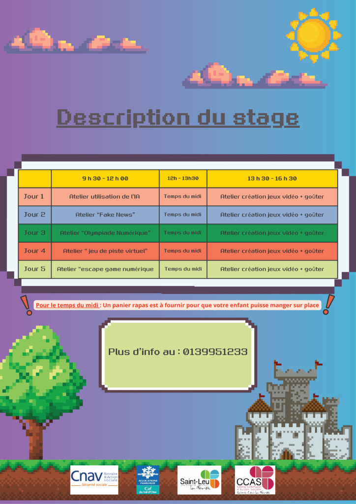 - Du 20 au 24 avril : Stage « Création de jeux vidéo » (30 €)